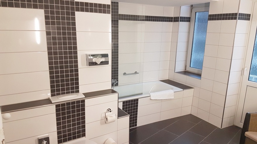 In diesem Fall war es ein tolles und großes Zimmer! Hell und geräumig gestaltet mit einem großen bequemen Doppelbett und einer Couch sowie einem Schreibtisch und TV. Das Bad war sehr modern mit einer großen Badewanne und einem Doppelwaschbecken. Na nu wo ist denn der Kleiderschrank? Eine 3. Tür? Neugierig öffneten wir die Tür und siehe da ein Ankleidezimmer mit Safe und Kofferständer sowie dem Kleiderschrank.