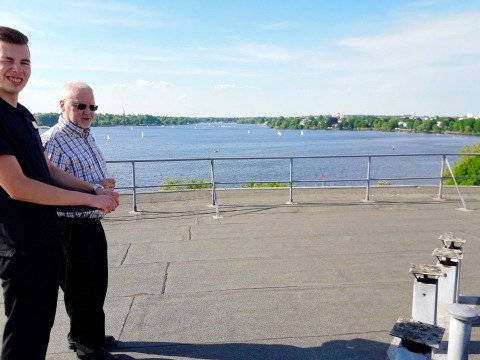 Über Landungsbrücken und St. Michaelis ("Michel") zurück zum Hotel, denn für diesen Abend haben wir das Menü im feinen Restaurant "Unter Deck" gebucht. Erst ein Aperitif auf dem Hoteldach mit einem weiten Blick über die Türme von Hamburg und die in der Sonne funkelnde Außenalster mit unzähligen kreuzenden Segelbooten; es ist traumhaft ruhig hoch oben über dem brausenden Feierabendverkehr, ein junger Hotelangestellter - echter Hamburger - gibt gerne Erklärungen zu "seiner" Stadt. Wir können uns kaum von der Dachkulisse verabschieden, nun aber in den maritimen Keller "Unter Deck". Auch dort werden wir aufmerksam und freundlich bedient. Das Menü entspricht voll und ganz unserem Geschmack - der zweite Abend klingt aus.