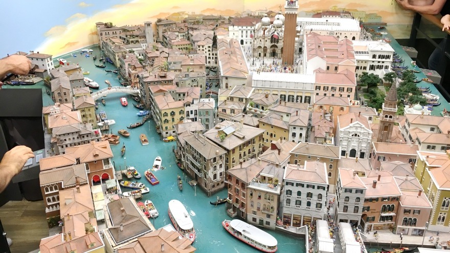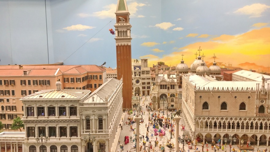 Der Blick auf die Uhr zeigte 13.00 Uhr .. jetzt ab ins Wunderland, um die gebuchte Reservierungszeit nicht zu verpassen. Und dann stand ich vor Venedig – mit Venedig haben sie sich selbst übertroffen, obwohl ich dachte, das wäre schon gar nicht mehr möglich. Diese Liebe zum Detail, die alles so originalgetreu macht, dieser liebevolle Blick für Kleinigkeiten mit dem Schuss Humor sind einzigartig. Wenn zur „ora amore“ das Haus bebt, ein Teil der Hauswand fällt und ein Paar im Bett aktiv ist, wenn bei der Runde von Commisario Controlletti die Ware der Straßenhändler verschwindet, wenn in der Gondelwerkstatt die Persönchen aktiv werden und streichen, wenn die Fahnen vor San Marco hochgehen...wird geschmunzelt und gelacht …es ist so großartig und schön.