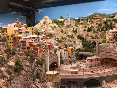 Weiter geht es zu den bunten Häuser der Cinque Terre und zur Amalfi Küste. Pompji ist dabei - und sogar das Mosaik "Cave Canem" aus dem Haus des Tragödiendichters ist winzig klein und klar erkennbar nachgebaut. Ebenso die Wandmosaike im typischen Pompeji Rot. Da fehlen fast die Worte. Alle 15 Minuten wird es Nacht - und jede Nacht bricht der Vesus aus. Mit leichtem Grollen und ein wenig Gestank kündigt sich der Ausbruch an - und auf dem Höhepunkt fährt ein Zug über die Hochbrücke. Und schmunzelnd dachte ich: ja auch heute würde keiner dies bezaubernde Fleckchen Erde freiwillig verlassen!